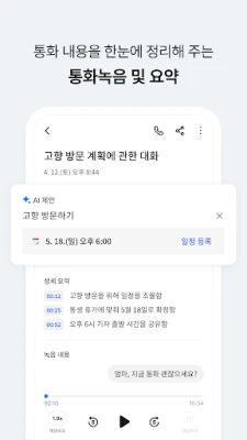 AI가 추천하는 대화 주제를 볼 수 있고 통화 직후 방금 한 통화 내용을 요약하고 통화에서 언급된 할일과 일정을 카드 형태로 모아서 알려줍니다.