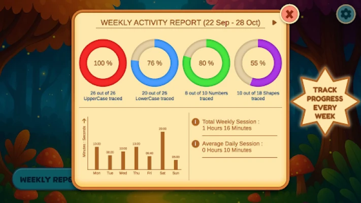 - Weekly progress reports: track activities, screen time, and improvements