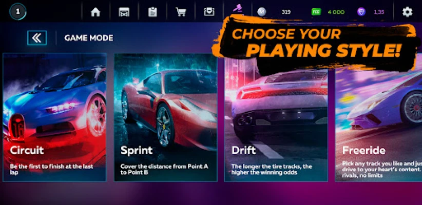 Upgrade cars by raising their level and parameters. Apply tuning components to get a competitive edge in races. Customize your Garage however you like using the abundant personalization options.