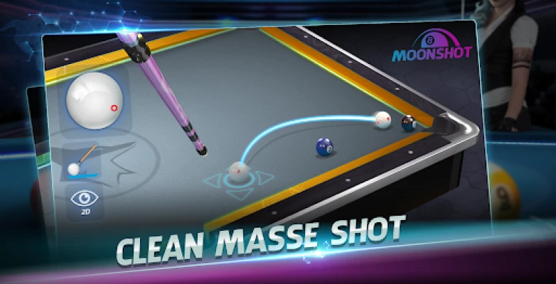 Moonshot offers playing pool (a.k.a pocket billiards) in 3D view as it should be played in real world. Spin shot, jump shot, massé shot,... you name it, we have it.