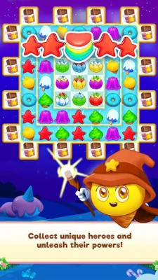 Meet with the Candyland inhabitants and travel together. Soda, Chocolate, Ice Cream, Jelly, and more cute friends are waiting for you. Match and swap your own sweet road through the Ice Cream Forest and Candy Valley! These are all home scapes for many desserts!