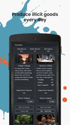 Acquire unique Production buildings to generate merchandise and wealth each day which can be used on the player-ran La Paz Market, or visit Julio's Club where you will recruit fearless Sicarios, arm them to the teeth, and unleash them on Bolivia to acquire untold riches.