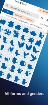 This app is designed to help you track your dex across all games . - Track your regular dex, living dex, and shiny dex - Check images, types, where to find and moves - See all the evolutions and alternate forms - Track both the regular dex and expansions