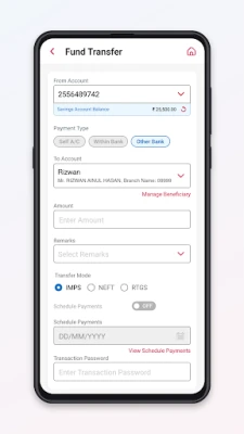 • Fund transfer to other banks through NEFT/IMPS.