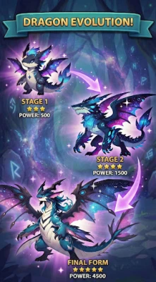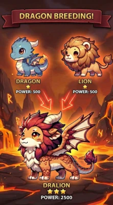 Master the Art of Evolution and Breeding Your dragons won't stay little forever. Nurture your squad and witness awe-inspiring transformations through a deep Evolution System. Watch as cute, chibi hatchlings grow into majestic, powerful behemoths, gaining incredible new forms and massive power boosts. Want something truly unique? Step into the Breeding Den! Combine different elemental dragons to discover rare hybrids. Fuse a standard Dragon with a Lion material to create the exclusive, powerful "Dralion." The possibilities for creating the perfect team are endless.