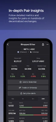 - Real-time charts and trades - Unlimited watchlists - Unlimited price alerts - Customizable screeners with several metrics such as volume, price change, liquidity and market cap - Support for 60+ chains, hundreds of DEXes and hundreds of thousands of pairs