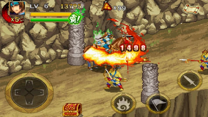 Dragon of the Three Kingdoms (DOTK) is an Action RPG(arcade beatem up). It is very easy to play for anyone. Use the touch control gamepad to move Zhao Yun, and push the SWORD icon button to fight with enemy or pick up items and flags. By collecting a fixed amount of flags, you can push the FLAG/MAGIC icon button to take a full-screen attack. When the green bar in the left up side fulled, you can push the FIRE icon button to launch a special powerful attack. Sometimes the FIRE icon button change into the HORSE icon button, it mean that you could ride the horse or elephant by your side immediately. When you are riding, you become more speedy and powerful.