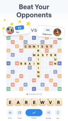 In this word puzzle game, players take turns to compose words with the letters from their deck. Each letter has its own points. The main goal is to reach the highest score by making words on the board with your letters. Unscramble words and sharpen your mind, anytime and anywhere.