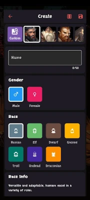 Create your characters by choosing their race, gender, guild, and portrait. Hardcore mode adds extra challenge: if your character dies, there's no coming back. Pick a custom avatar from your device's gallery to make your hero truly unique.
