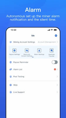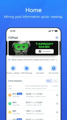 The f2pool app offers a simple way for everyone to manage their mining operation. Conveniently manage your mining machines, view your revenue, and even utilize our one-click button to switch between logged-in and anonymous mining. Miners can access every function of the website through the app, including the ability to set up custom alerts for any worker or group.