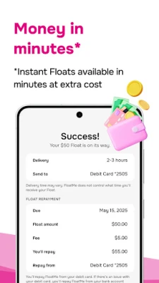 Membership is required to request cash advances; approval of your request is not guaranteed. Membership costs $4.99/month and provides access to FloatMe's suite of financial products and services. Not available in all states. Advances are NOT loans and have no minimum or maximum time for repayment. This is a non-recourse product, not a personal loan, and you will not be charged interest, late fees, or be subject to collections activities. FloatMe's advance service is not a loan nor is it a contracted obligation to repay a loan. We are NOT a payday loan, cash loan, or personal loan app, nor an app to borrow money. Money advanced has 0% max interest. 0% APR. Instant Float fees are not included in the monthly membership cost and are optional. Instant transfer fees vary from $1-$7.