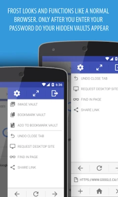 Frost+ is the best private tabbed web browser for Android, with a hidden, password protected image and bookmark vault as well as extensive privacy features.