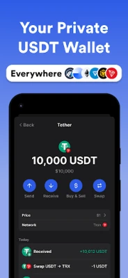 - Send and receive coins, including USDT, BTC, ETH, and more.