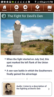 The Gettysburg Battle App®: July 2 is the perfect tour partner for your visits to some of the Gettysburg battlefield's most famous places, Devil's Den and Little Round Top. This GPS-enabled tour app focuses exclusively on the July 2, 1863 fighting and provides in-depth detail on the action that took place on this iconic historical landscape. Click on our "virtual signs" to access a wealth of information related to the very location where you are standing. Onboard historian videos, audio accounts from soldiers and civilians, photos, facts, and more are just a click away. Never has so much information been made available in such a portable device!