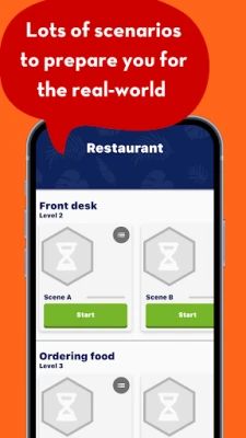 Visit different locations and scenarios to learn how to use a language in context.