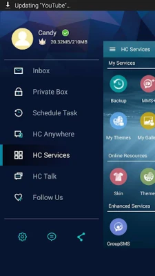 Open navigation drawer->Handcent Services->Skin