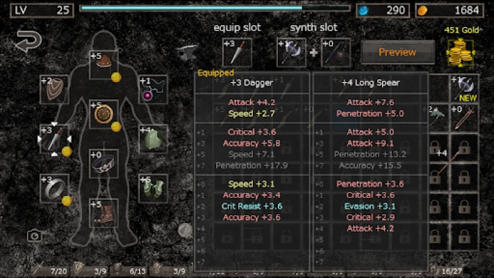 Equipment can be obtained by acquiring them as loot from monsters or by gathering materials to craft them. The crafting system for equipment production encompasses a variety of roles, including ore processing, material mixing, alchemy, and concoction. Equipment with the same name can be enhanced through synthesis. Since all equipment has randomness, it is necessary to carefully select and proceed with synthesis using suitable gear to cultivate equipment that matches your preferences. There are achievements related to the crafting and synthesis of equipment, so even low-value equipment is not rendered useless when nurtured.