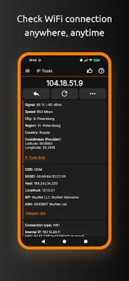 IP Tools has a simple interface, so you can receive within seconds full information about connection, find out local, internal or external address (with my IP), SSID, BSSID, DNS, ping time, Wi Fi speed, signal, broadcast address, gateway, mask, country, region, city, ISP provider’s geographical coordinates (latitude and longitude), whois, netstat and other basic information.