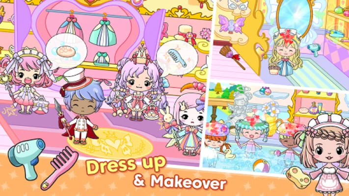 - Many cute characters, such as little princess, handsome prince, king, queen, maid, and chef, letting you create your own story freely.