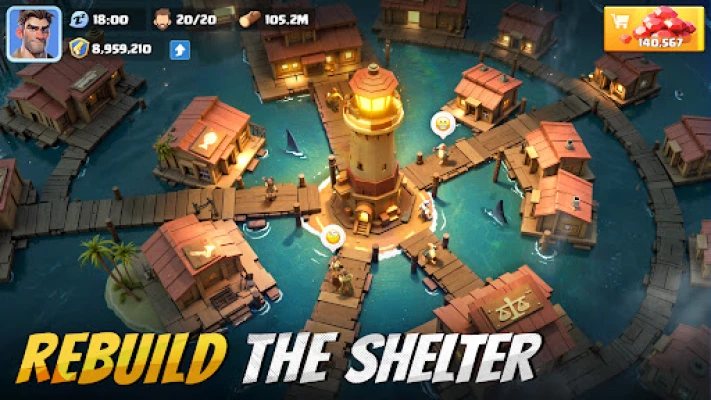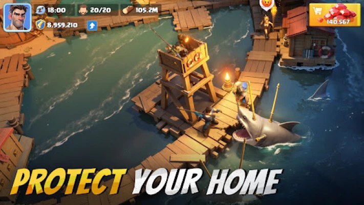 Construct and upgrade shelters at sea, gather and produce resources, and strengthen your base defenses.