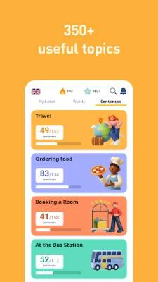 • 5,000 English phrases (frequently used): the most important phrases for daily conversations and travelling, categorized into 10 levels and 120 topics.
