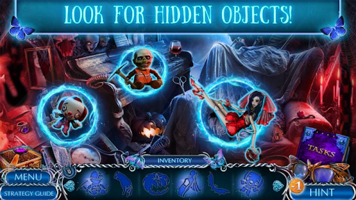 Collect Tarot cards while you find objects. Dare you learn your future? Gather all the cards and other Bonus materials in mystery hidden object games! Collect butterflies as you seek and find to purchase all the cursed items for your collection!
