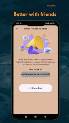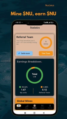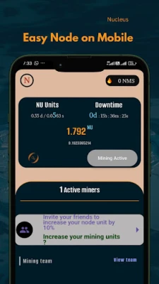 Mining Rate; Upon registration, the mining rate stipulated for every account is 0.5 NU/24hrs. Users who want to increase their earning hash will have to play the role of a networker by recruiting friends and family to join Nucleus Core with their Unique Reference link. By so doing, you are creating a team, and each team member redirect to you 10% of NU units, it also contribute to your NU whenever your team members are actively mining.