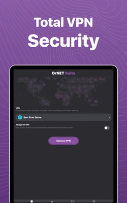 Navigating through OrNET Security Suite is a breeze, thanks to a user-friendly VPN shield interface with simple, one-tap options. No registration or login is required, prioritizing your convenience.