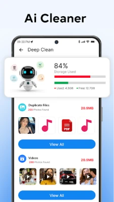 Ai cleaner has multiple tools like junk cleaner to remove junk files and storage cleaner to clean up storage space. Phone cleaner also has duplicate cleaner to find and clean duplicate photos and files, and a large file cleaner to clean up space taken by big, unnecessary files.