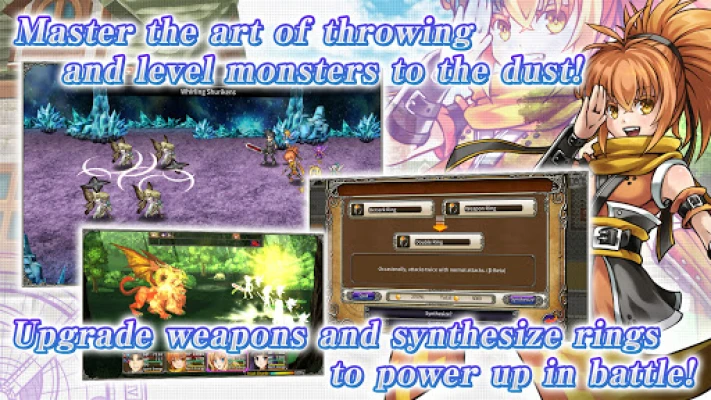 Master the art of throwing and level monsters to the dust! Get powerful support from spirits that can be equipped to enhance magic, and upgrade weapons and synthesize rings to power up in battle. You can even get special endings by building up trust with other characters, and take on the strongest at the battle arena to enjoy this fantasy RPG in its entirety.