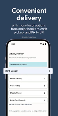 • Delivery options for money transfers include bank account money transfer, cash pickup, and digital wallet
