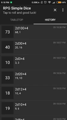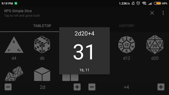 - default dice: d4, d6, d8, d10, d12, d20 and d100 - custom dice: make a d3 or any other die specifying the number of sides - roll X times the dice (1 ~ 100) - modifier (-100 ~ +100) - history
