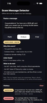 You will see a risk score (SAFE, SUSPICIOUS, or DANGEROUS) along with practical safety advice.