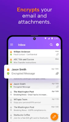 The SecureMyEmail™ secure email app for Android provides easy PGP email encryption for any email address so everyone can enjoy the privacy of end-to-end encryption without having to switch their email provider.