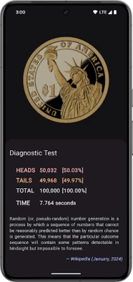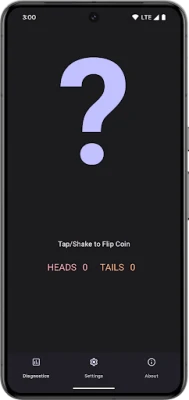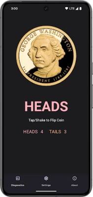 Simply tap the question mark or shake and view the result. Tap the coin or shake to spin the coin again. Verify the flip algorithm is truly random by running the built-in Diagnostic Test and flipping the coin 100,000 times (or more) while watching the results in real-time. (Sorry, no cheating!)