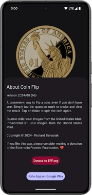 Oh, and Google finally realized that having an official API for loading resources from any app installed on your phone was not great from a privacy perspective, so no more support for "add-on packs". If you bought the Simple Coin Flip Mega Pack in the past, I appreciate it. This new version has all 50 state quarters included for free.