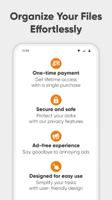 This file organizer is absolutely secure, containing multiple powerful security-related functions, like password protecting hidden items, deleting or opening the whole app. You can choose between using a pattern, pin, or a biometric lock to keep your data private. The fingerprint permission is needed for locking either hidden item visibility, deleting files, or the whole app. Simple File Manager works without internet access, further guaranteeing your ultimate privacy.