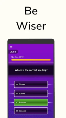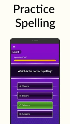 spelling game app. You have to identify the correct spelling of 10 words to be able to qualify for the next level. Each level in this english spelling game is different from the previous one and has a completely different set of commonly misspelled words for you to guess.