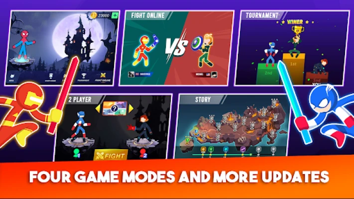 Players may select their Stickman Super Heroes, who they love most, upgrade their ultimate power as much as possible, compete in the tournament of all maps, and rise to the top of the global standings.