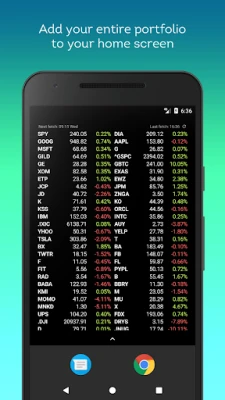 Features: ★ Completely resizable, it will fit the number columns base on the width you set. ★ Scrollable, so you don't have to worry about adding more widgets ★ Stocks are sorted by change in percent (descending), or you can rearrange them yourself ★ You can set custom refresh intervals and start/end times ★ You can import and export your portfolio from a textfile ★ Add multiple portfolios to multiple widgets ★ View recent news for your tracked symbols ★ View graphs for your tracked symbols