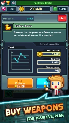 Using your knowledge as a business tycoon, you’ll have to invest and trade in questionable businesses and resources on the black market to make your evil quest a profitable one. View charts to predict the markets, get your henchmen to trade for you and – hopefully – make another trillion dollars! As you grow you’ll get fans and receive free gifts as a reward for being so damn evil!