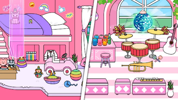 In Tizi Town, the fun extends beyond just decorating. Step outside your dream home and explore a bustling pink world filled with inspiration and creativity. Walk through vibrant streets, visit virtual stores packed with decor items, and find ideas to transform your pink room or pink mansion. The dynamic environment allows players to interact with friends, share design ideas, and enjoy fun activities like parties, gatherings, and even design challenges.
