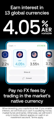 - High interest on your uninvested cash: 4.05% on GBP, 2.2% on EUR, 3.55% on USD, and more. Paid daily. Terms apply.