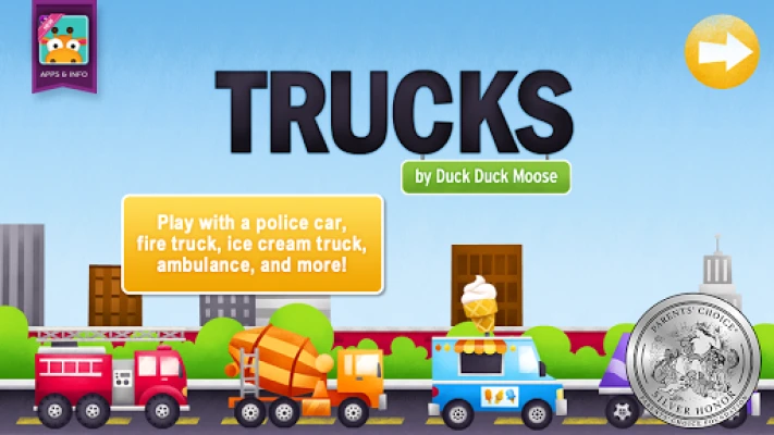Duck Duck Moose's award-winning educational, creative play app, Trucks has 5 engaging activities: carwash, tow truck, garbage and recycling, bulldozer and dump truck and a car and truck parade. Trucks teaches sequencing, sorting and problem solving. AWARDS: Parents’ Choice Silver Award, Children’s Technology Review Editor’s Choice Award. AGES: 2-6.
