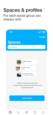 - "Spaces" to organize your profiles, relations, conversations, notifications, appearance and parameters, according to each social group you interact with. Different Spaces can be used for interacting with your family, friends, colleagues, sport mates, etc.;