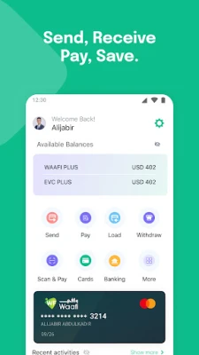 Transfer money securely anytime, anywhere. WAAFI allows you to send and receive funds instantly, whether it's to friends, family, or for everyday purchases. Our wallet is fast, safe, and reliable.