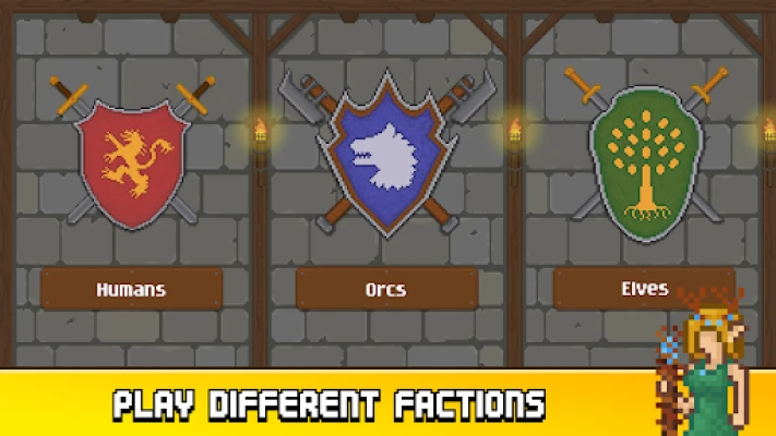 Choose a weapon shield for the kingdom you want to fight as and use their troop types. Humans, Orcs, Elves and more coming. Epic pixel war!