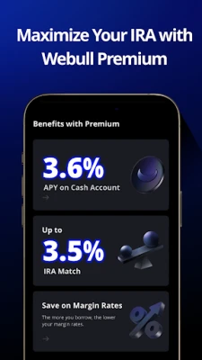 - Unlock 3.6% APY cash management and up to 3.5% IRA match through Webull Premium (subscription required)