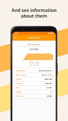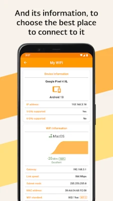 Obtain the signal strength of the WiFi network to which you are connected and the WiFi networks that surround it. This is useful so you can find good areas to connect to WiFi networks. In addition to the signal strength of the WiFi network, other relevant features can be observed, such as the MAC address, the WiFi network security, BSSID, etc.