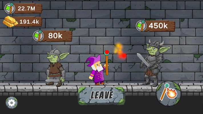 Face unique bosses like the mysterious Brain in a Jar, stone Golems, and Goblins. Each boss requires enough battle coins to challenge — and defeating them rewards valuable gold.